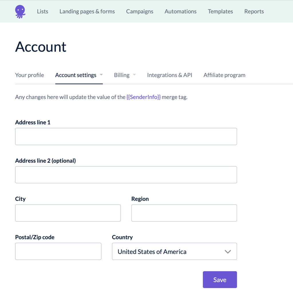 To do this on EmailOctopus, navigate to your account settings. You can add or update your business information in the Sender info tab.