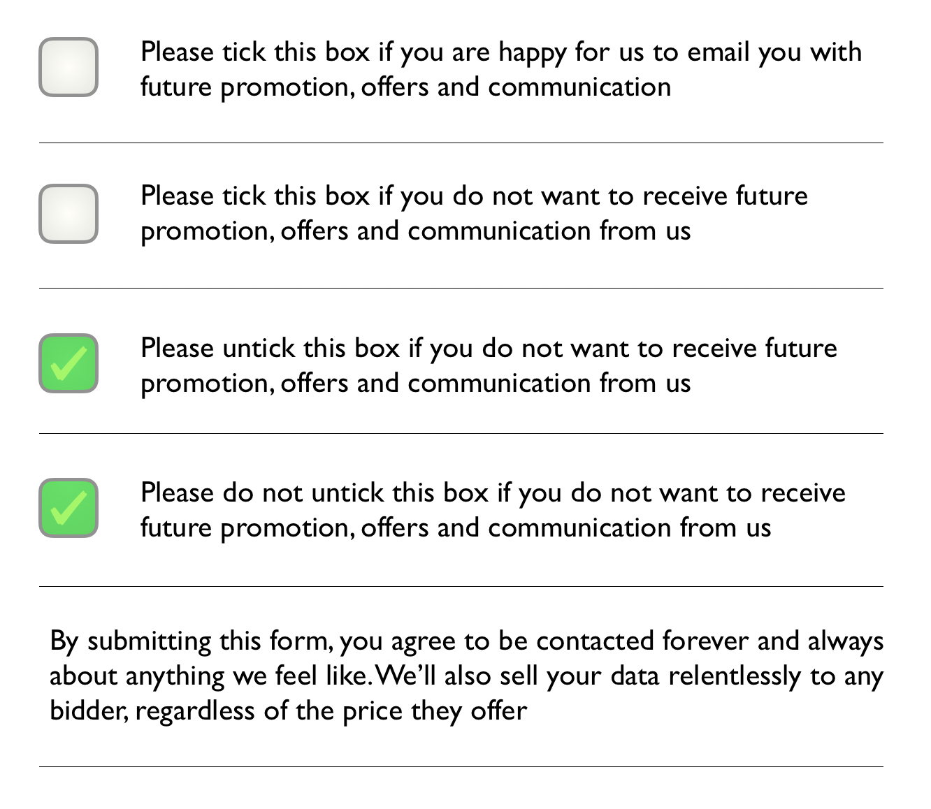 In other words, when the email address was collected, did you get permission from the owner to use it in future lists? And on that note, were you clear to the recipient about the types of messages they would receive? You need to deliver what you’ve promised and not change the parameters later on, because subscribers will quickly realise what you’re doing and unsubscribe.