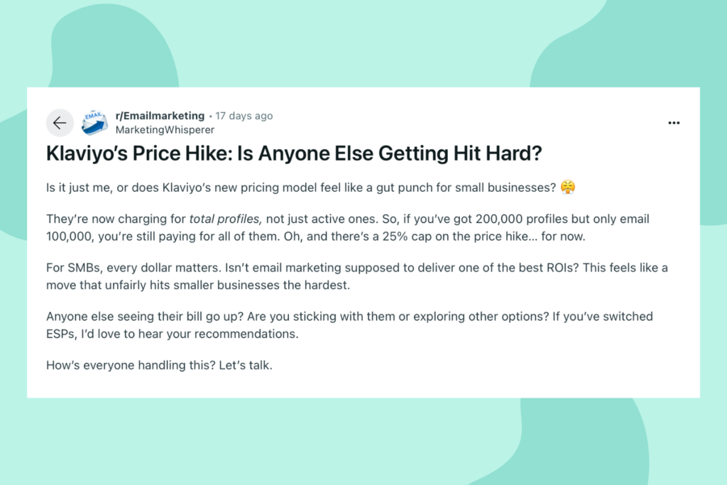 Klaviyo recently announced an automatic upgrade or downgrade for customers based on their “Active profiles” of subscribers. Some customers are pushed onto a bigger plan even though their list size stays the same, resulting in a big price bump.
