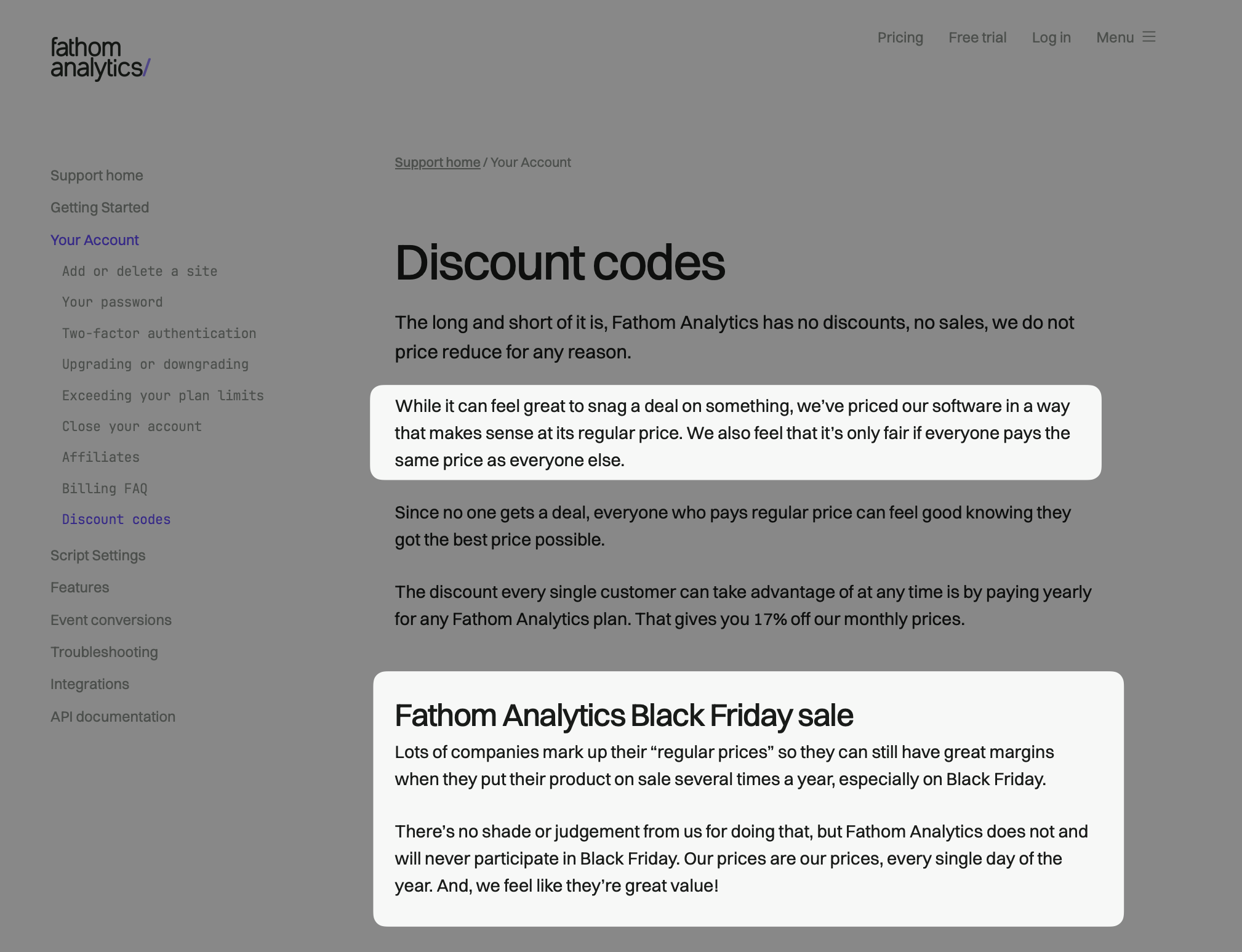 Take Fathom Analytics as an example: they clearly explain why they never plan to offer discounts, yet people still love and use their product.