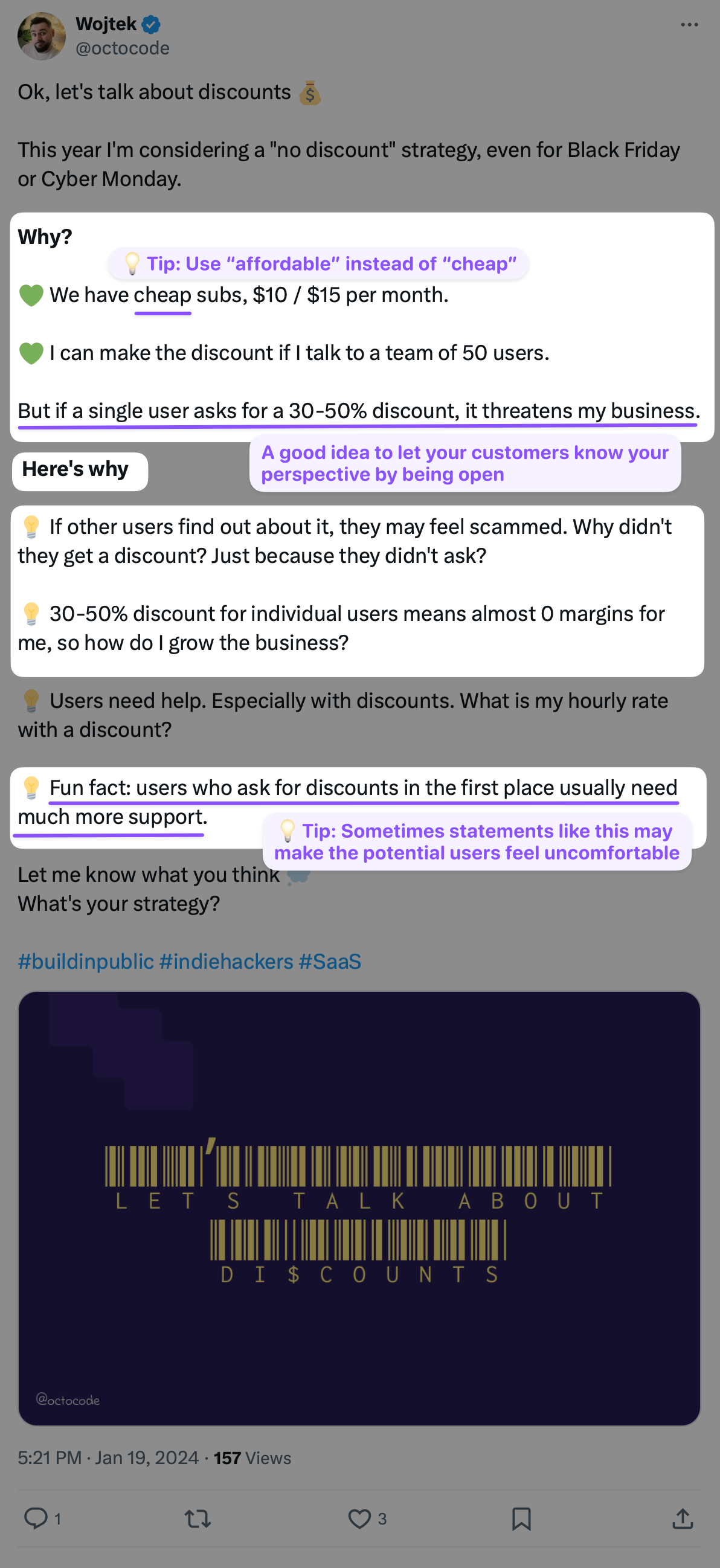 Here’s an example of a post on X (formerly Twitter) by a solopreneur announcing the decision not to offer any discounts for Black Friday or Cyber Monday, along with the reasoning behind it.