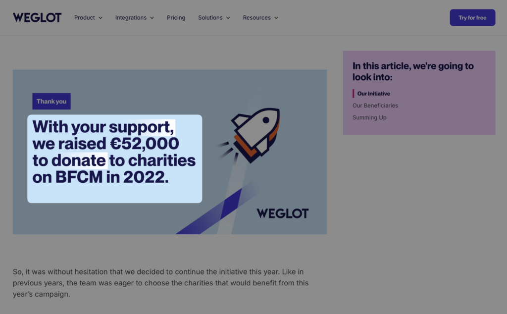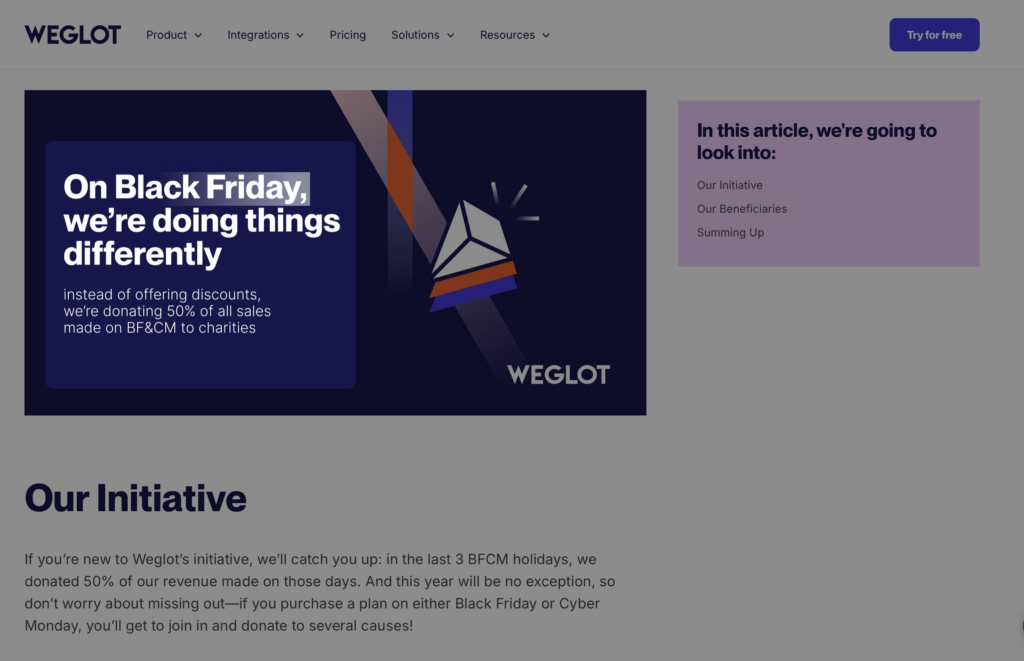 For example, here’s a blog post by WEGLOT, a SaaS company that donates 50% of its profits during Black Friday and Cyber Monday to various charities.