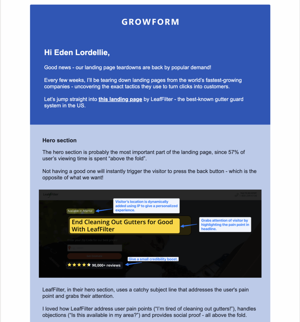 Above is an email newsletter by Growform, which primarily focuses on informative and useful content rather than directly marketing their product. This makes the recipient feel connected.