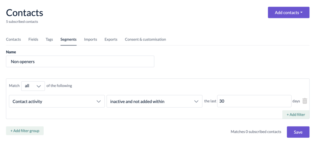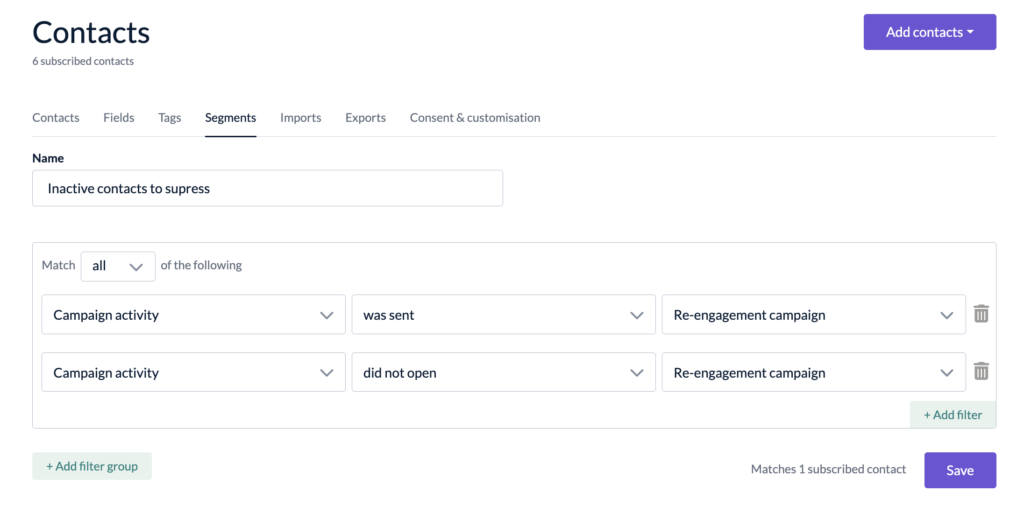 To send a re-engagement campaign, start by identifying inactive contacts using a segmentation feature. Create a segment based on contact activity to locate those who haven’t engaged recently.