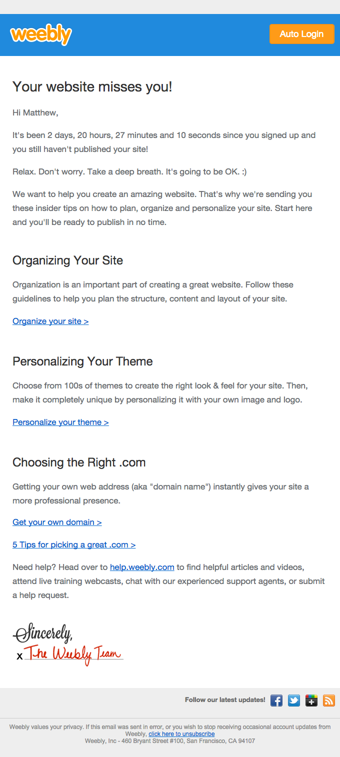Weebly’s email is a bit different from ProductHunt’s email. They understand that some users might have abandoned their platform because they found it difficult to use. To fix this, Weebly’s email contains links to guides which can potentially make users return to the platform.