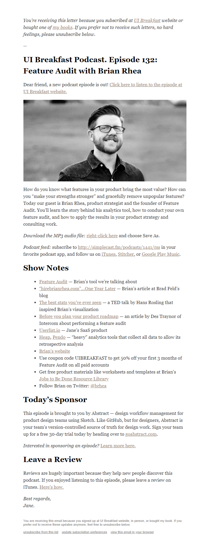 Alternatively, you can use your email to explain the content of your podcast episode. In the example below, Jane from the UI Breakfast podcast summarises what subscribers will learn from her latest episode.